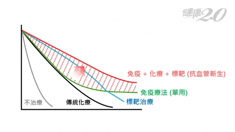 ▲「三代組合療法」,晚期肺癌患者整體死亡風險下降約2成。(圖片來源/台灣臨床腫瘤醫學會)