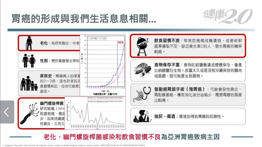 陳立宗表示,現在大家都常擔心「吃這個傷肝、吃那個對肝不好」,但其實胃癌也和我們日常飲食和生活習慣息息相關。包括吸菸喝酒、老化、家族史等,皆可能提高罹患胃癌的風險,其中,老化、幽門螺旋桿菌感染,以及不良的飲食習慣更為亞洲人胃癌致病主因。