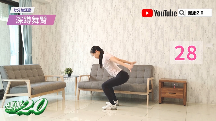 雙腳打開與肩同寬;接著先微微往上跳後,臀部往後,雙腳往外打開,向下做相撲深蹲,雙手垂在身體前方;身體向下時雙手輕輕碰地。碰地後身體往上,雙腳往內跳,回到雙腳與肩同寬的位置。反覆練習30秒。