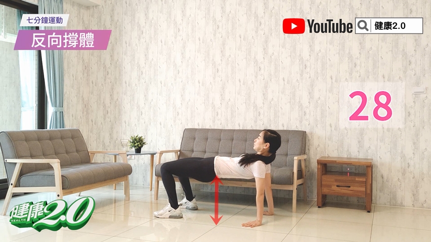 臉和身體朝上,用雙手雙腳支撐著地板;接著用髖部的力量上下活動。重複動作30秒。