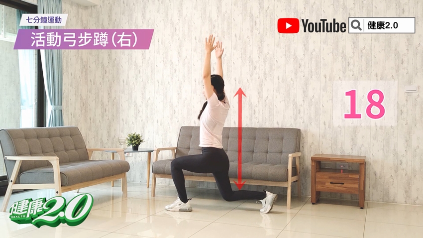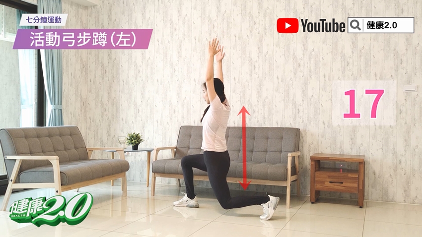 雙手往天花板伸直,左腳蹲著彎曲呈90度,右腳放在後方,膝蓋不碰地呈弓步;接著身體上下活動,重複動作30秒。