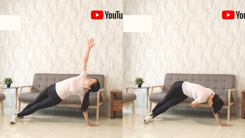 身體側身撐地,另一隻手往天花板延伸;接著帶動身體往下方旋轉後再回正。重複動作30秒。做完換邊。