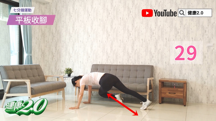 雙手手臂支撐在地上,身體俯臥,手掌間距與肩同寬;接著左右腳輪流往前方彎曲收起。重複動作30秒。