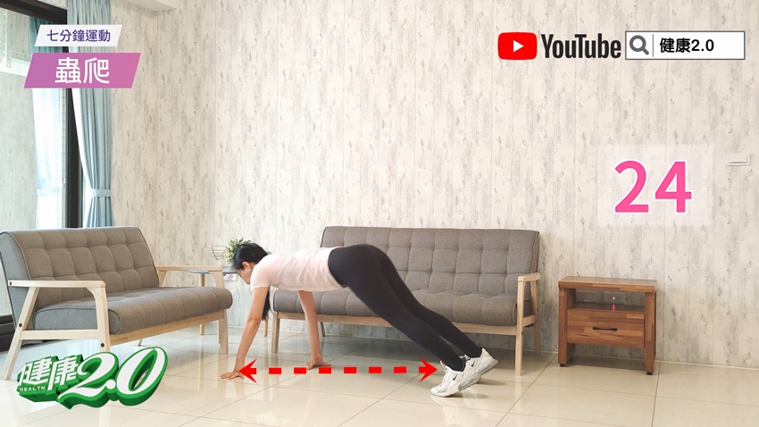 身體站直後,俯身向前,用雙手碰地,接著雙手向前爬行,直到身體呈現筆直後,雙手再爬回原始位置。重複動作30秒。