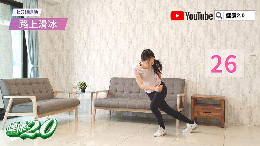雙腳打開與肩同寬;接著左腳向右側跳,再快速換成右腳往左側跳。反覆動作30秒。