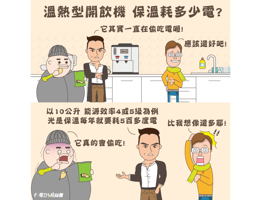 以10公升左右的溫熱型開飲機為例,耗電程度也很高: