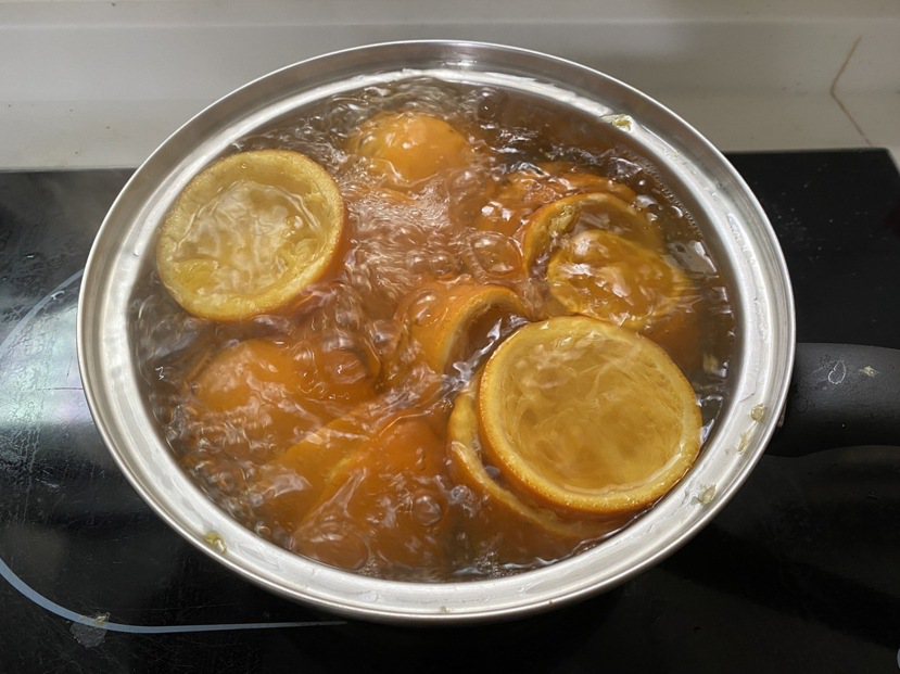 ▲煮完橘子皮的溫水可去油、柑橘皮也有清潔除油功效,再加上柑橘的天然果香,能達到清潔及除臭的雙重功效。(圖片/陳映如提供)