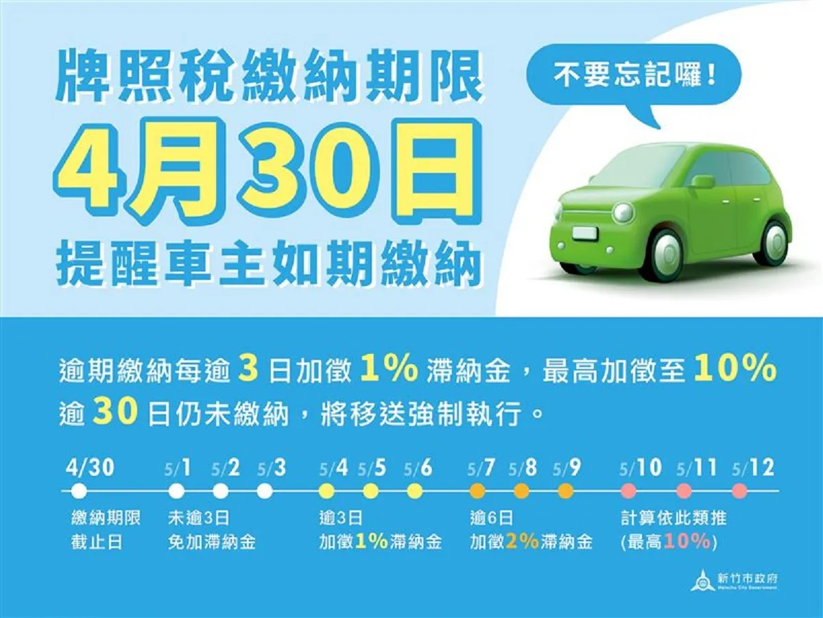 以新竹市為例,總共有17萬多輛車要繳稅,總金額將近15億元。截至4月16日為止,還有超過一半(58%)的人還沒繳。新竹市稅務局提醒,逾期每3天會被加收1%滯納金,最多罰到10%,再不繳還會被移送強制執行,真的划不來!