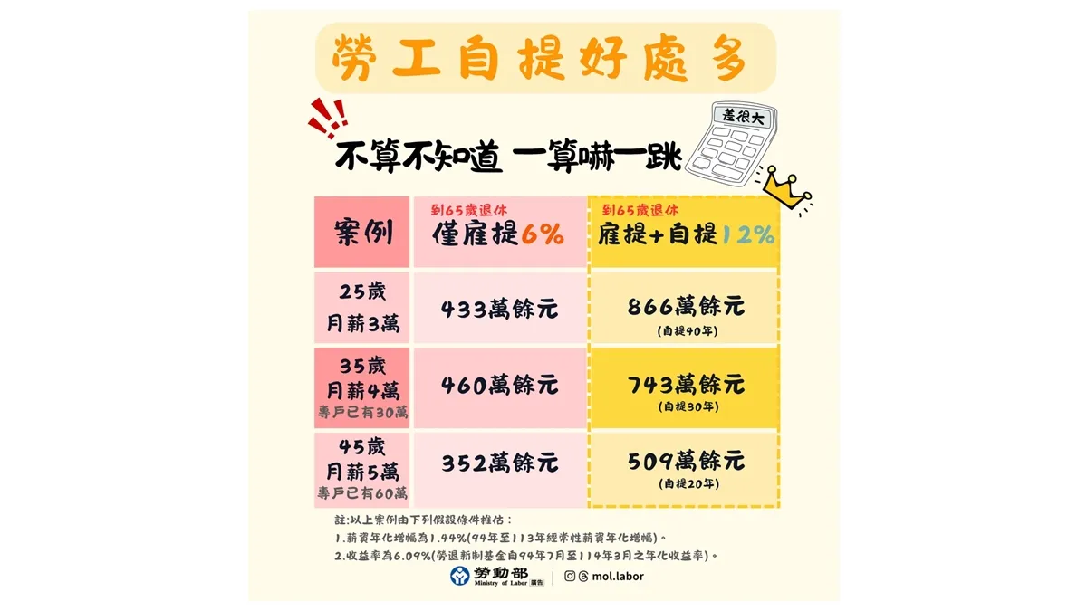 勞動部指出,退休規劃的關鍵在於「及早開始」,時間的複利效應將是累積財富的最佳幫手。舉例來說: