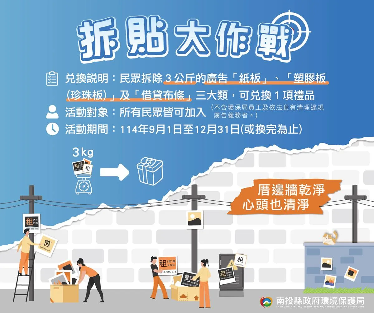 維護環境美觀與公共秩序,你也可以出一份心力!南投縣政府環保局邀民眾一起「拆貼大作戰」,把廣告換成洗碗精!從114年9/1~12/31止,只要動手拆除住家周圍違規張貼的紙板、珍珠板或布條廣告,累積重量達到3公斤,就可以到各鄉鎮市公所的指定地點,兌換一瓶環保洗碗精。