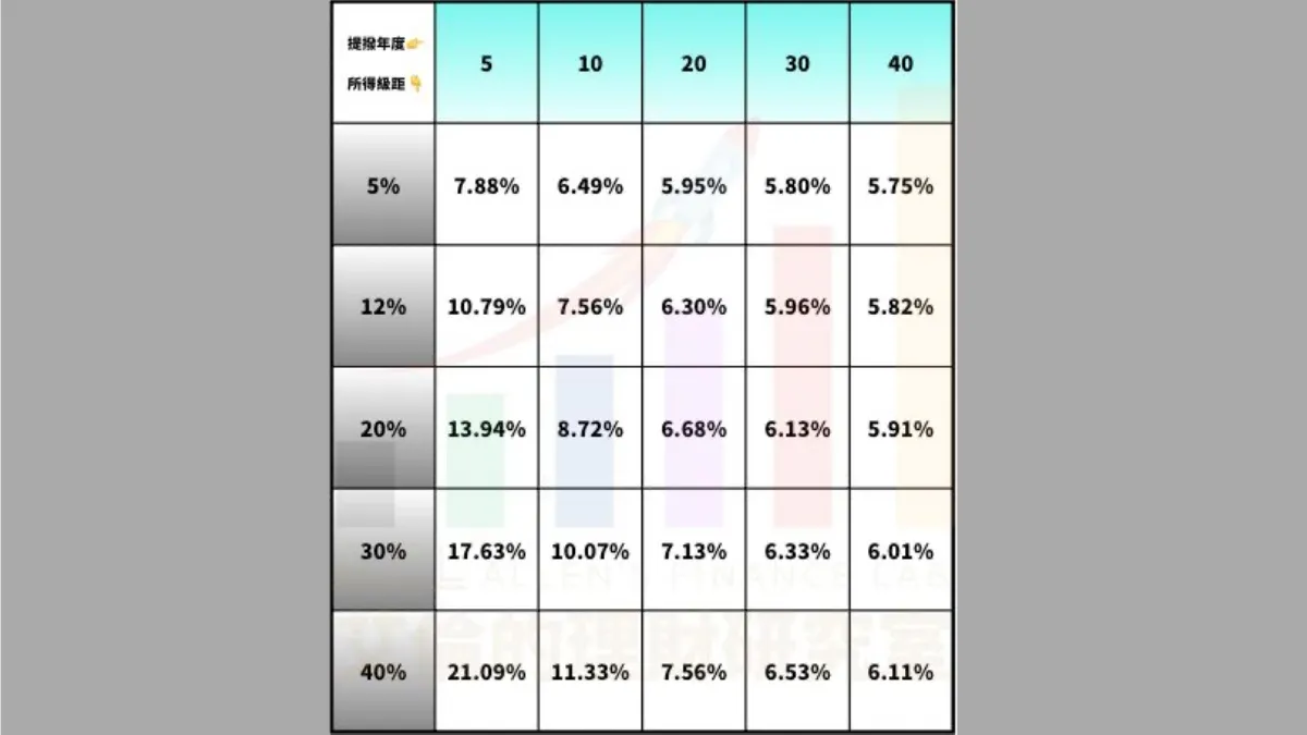 - 年收入490萬以上,稅率40%: 請領前5年或10年開始自提,年化收益率分別為21.09%、11.31%。