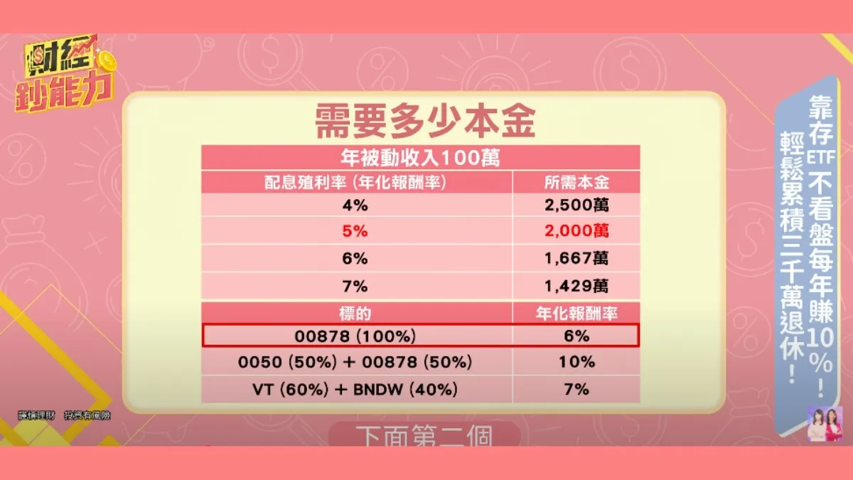 即使未達3000萬資產,但若能找到高年化報酬率的投資產品,仍可獲得每年100萬的被動收入。假設年化報酬率為4%,需準備2500萬本金;若達到7%,則僅需不到1500萬。