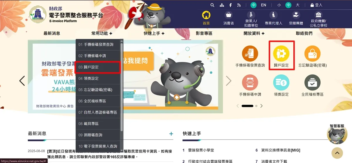 - 點選「常用功能」項下的「03歸戶設定」,或平台首頁右側的快捷圖示。