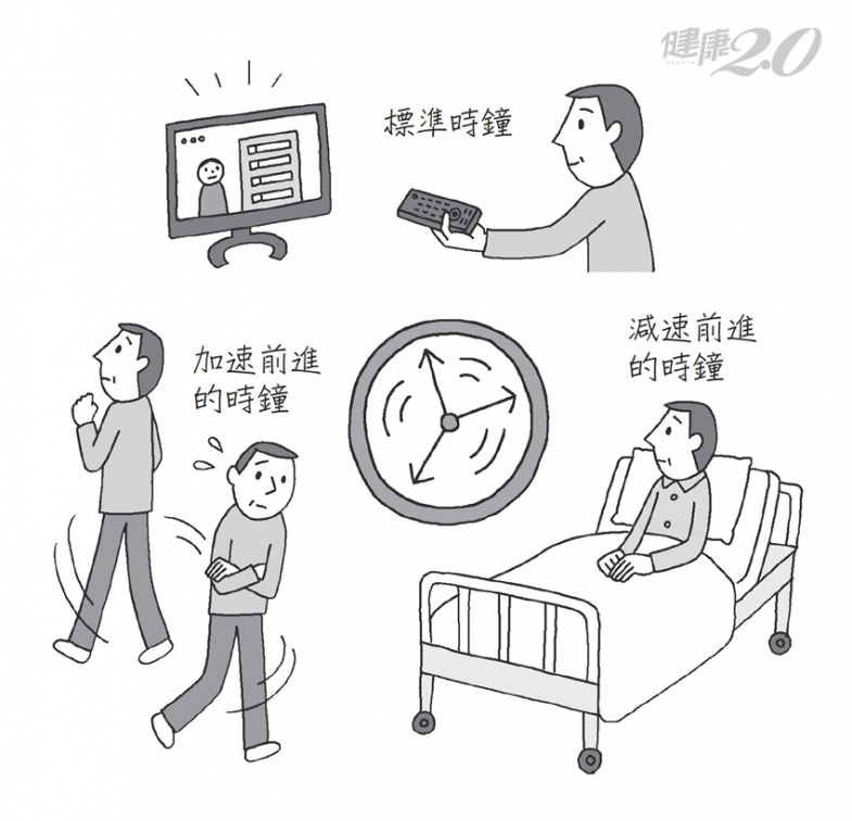 治療結束後在等待出院的期間,會用「減速時鐘」緩慢度過,在癌症末期被宣告沒剩多少時間時,則會用「加速時鐘」感覺時間稍縱即逝。患者會因為病況不同,感覺時間流逝的速度有所差異,所以有時候不管是平時急性子的人,或是慢調子的人,生病時都會判若兩人。