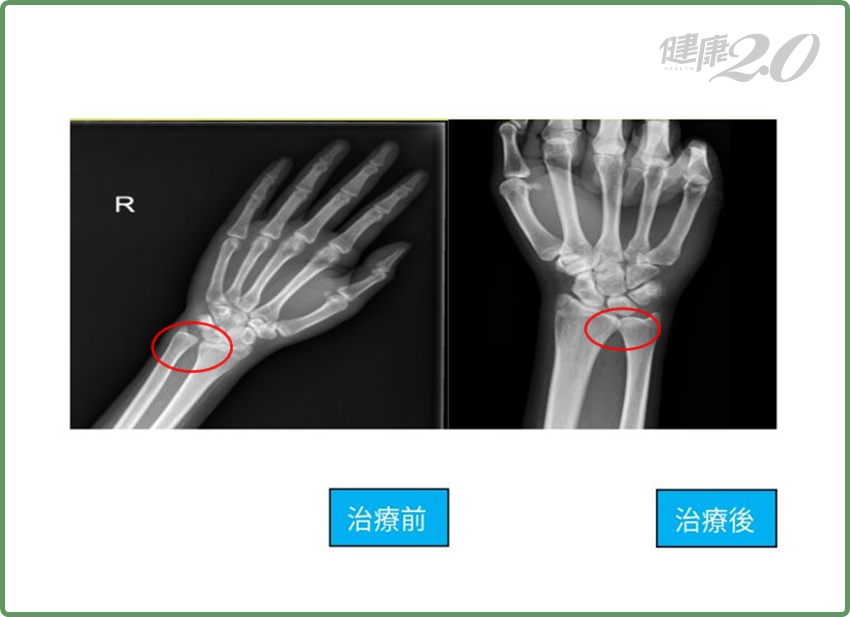 林小姐從事餐飲業,長期拿重的托盤及物品,造成她雙手三角軟骨受傷。因為被醫師告知要開刀,所以就近到安南醫院掛號準備手術。經過討論後,許惟傑建議她先施做增生療法較為適宜,沒想到治療後效果出奇良好,透過X光發現林小姐原本分開的遠端橈骨及尺骨關節已靠在一起,關節穩定度也佳,活動自然無卡卡且工作一切正常。