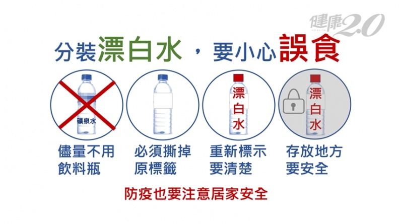 儘量不要用飲料瓶,尤其是用礦泉水瓶來裝漂白水或酒精,最容易出事。