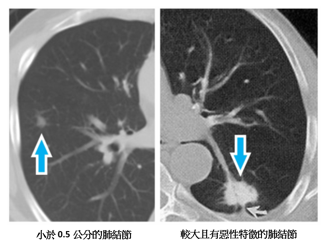 一般認為,小於0.5公分的肺結節,要是惡性的機率是非常非常低,在未來要變化成惡性或是轉移的機會也不高。除了大小之外,肺結節的外觀特徵及變化,也是非常重要的參考依據──有些患者身上的腫瘤,也許只有1公分,但是惡性的特徵非常明顯,就應該要盡早手術;有些患者的腫瘤是屬於惡性特徵很低的,要等到觀察有變化,才需要接受手術。