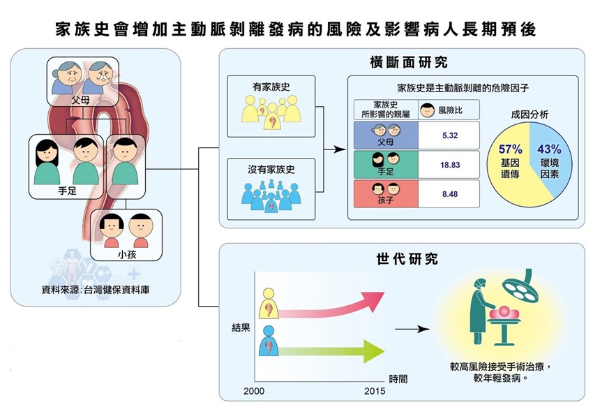 林口長庚醫院心臟內、外科及風濕免疫科團隊發表最新的研究報告指出,主動脈剝離疾病的發生,遺傳因素所佔比例超過一半;有家族病史者,會顯著增加家族成員的發病風險,一等親的發病風險可達6.82倍。