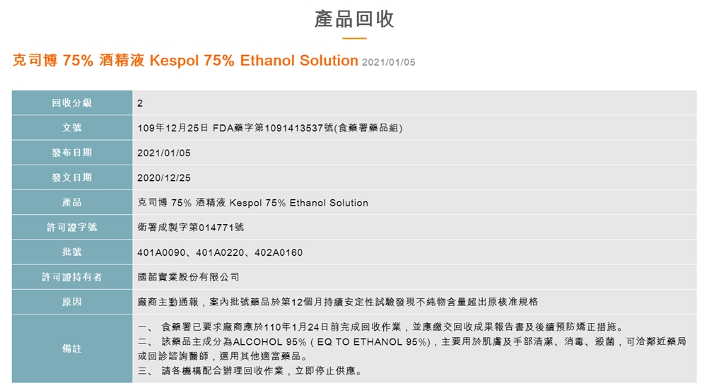食藥署表示,克司博75%酒精液(Kespol 75% Ethanol Solution)要下架回收不合格的3個批號「401A0090、401A0220、402A0160」,原因是廠商主動通報,案內批號藥品在第12個月持續安定性試驗發現不純物含量超出原核准規格。該藥品主成分為ALCOHOL 95%(EQ TO ETHANOL 95%),主要用於肌膚及手部清潔、消毒、殺菌。
