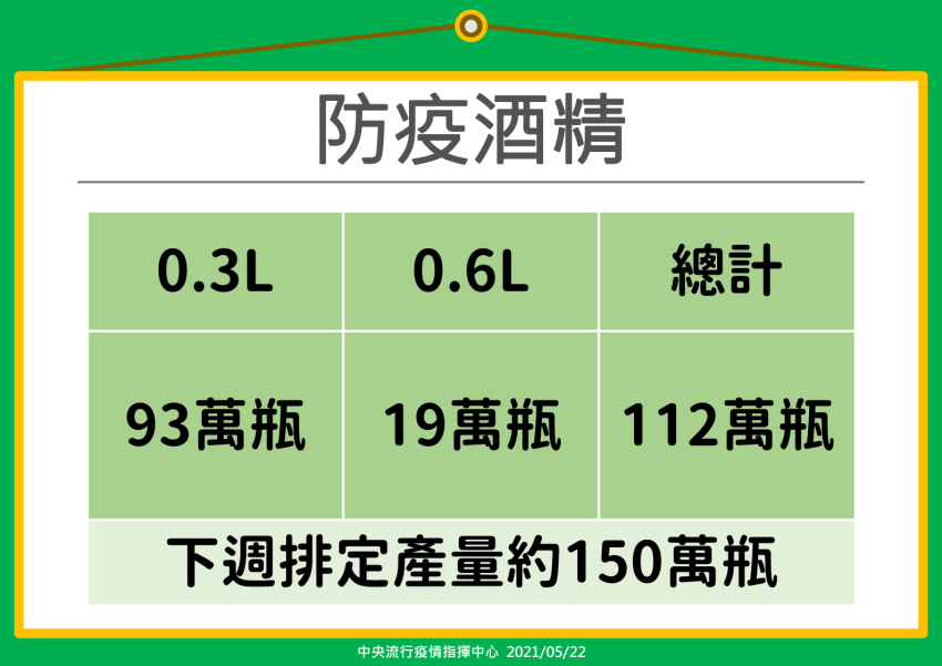 而針對近日民眾對酒精等防疫物資需求量大增,目前有112萬瓶分別是0.3公升和0.6公升的酒精已在派送中,下週已和台酒及5家民營廠商協調,將會增加產能到150萬瓶。針對防疫旅館需求增加,經統整資訊,目前全台防疫旅館全台總數有19,174間房,下週預計有1395房可上線,防疫旅宿量能總數可達20,569間房。