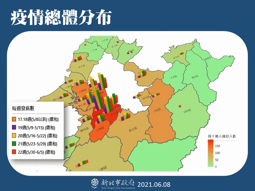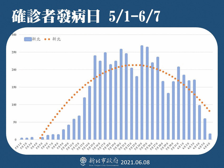 根據新北市總體趨勢圖統計,侯友宜指出,確診個案集中在板橋、三重、中和、永和、新莊,也就是萬華的周遭;再根據確診者發病日分析發現,「新北市疫情呈現穩定高峰,數字緩緩往下掉」。
