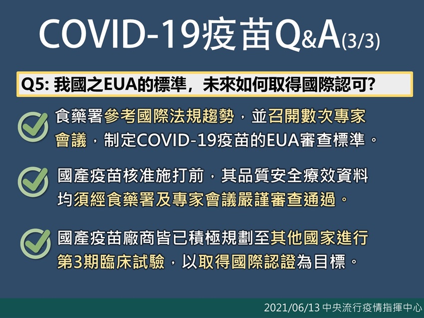 莊人祥說,食藥署會參考國際法規趨勢,並召開數次專家會議制定COVID-19疫苗的EUA審查標準,而國產疫苗在核准施打前,其品質安全療效資料,也一定會經過食藥署及專家會議嚴謹審查通過。國產疫苗廠商也積極規劃至其他國家進行3期臨床試驗,以取得國際認證為目標。
