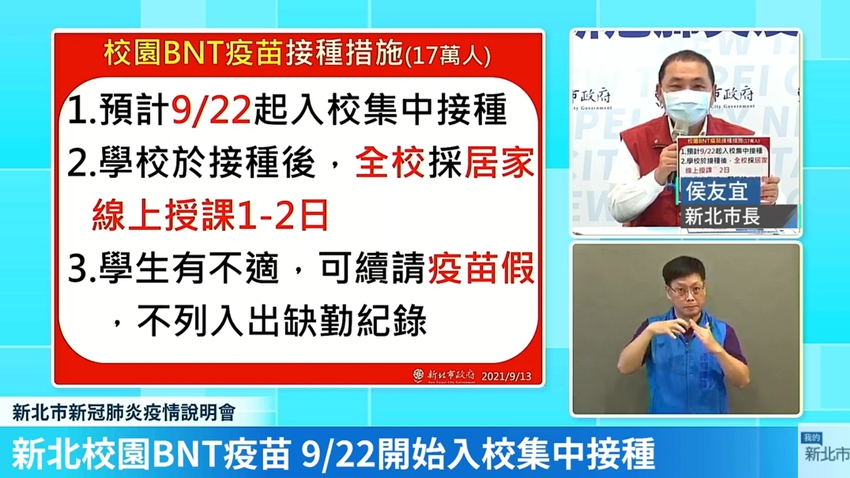 新北市17萬名學生9/22接種BNT疫苗!侯友宜:接種後全校居家線上授課 身體不適可請疫苗假