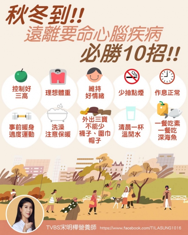 宋明樺說,預防秋冬心腦疾病上身,以上是必勝10招。如果無法一次做到位,可以慢慢分別把這些好習慣積累起來,身體保健康。