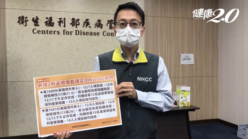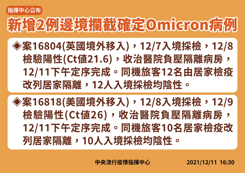 新公布的兩例邊境攔截的確定Omicron案例,案16804為英國境外移入,12/7入境採檢,12/8檢驗陽性、Ct值21.6,已收治醫院負壓隔離病房。12/11下午定序完成。機旅客12名由居家檢疫改列居家隔離,12人入境探檢均陰性。