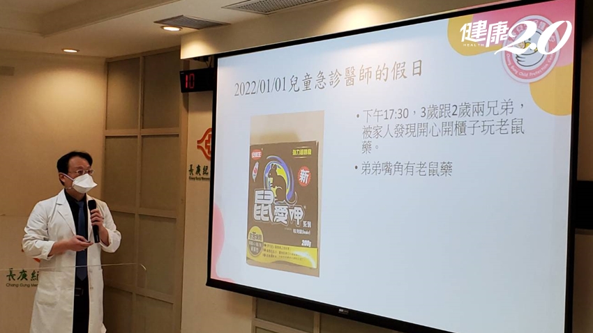 林口長庚兒童一般科主任李嶸回想,元旦當天,醫院急診接連處理了2歲男童誤食餅乾內的乾燥劑、4歲男童誤吞一個50元硬幣,以及一對不足3歲小兄弟打開櫃子玩老鼠藥,只見剩一個空藥盒,而且弟弟的嘴角還有老鼠藥殘留。