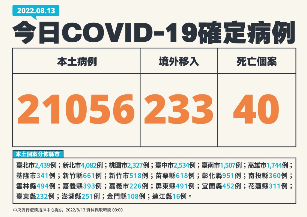指揮中心表示,今日新增之21,056例本土病例,9,658例為男性,11,388例為女性,10例調查中。個案分布以新北市最多,有4,082例,其次依序為臺中市2,534例、臺北市2,439例、桃園市2,327例、高雄市1,744例。臺南市1,507例、彰化縣951例、新竹縣661例、苗栗縣618例、新竹市518例、雲林縣494例、屏東縣491例、宜蘭縣452例、嘉義縣393例、南投縣360例、基隆市341例、花蓮縣311例,澎湖縣251例,臺東縣232例,嘉義市226例,金門縣108例,連江縣16例。