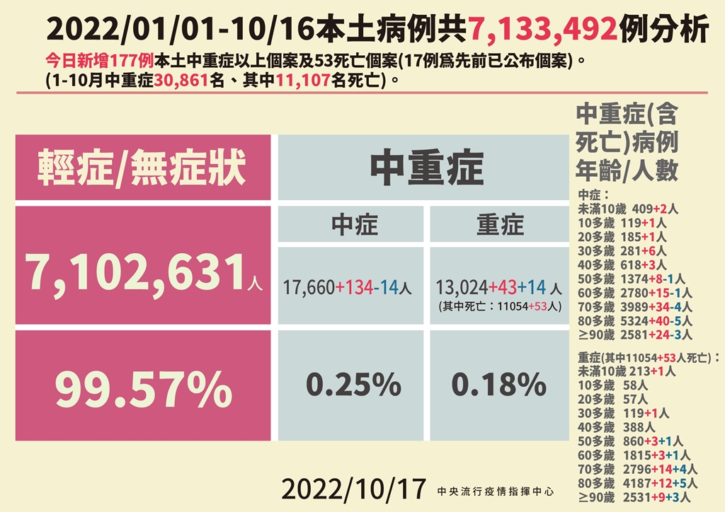 中央流行疫情指揮中心醫療應變組副組長羅一鈞指出,今日新增177例中重症、53例本土病例死亡個案,死亡個案為26例男性、27例女性,年齡介於50多歲至90多歲以上,皆屬重度感染、48例具慢性病史、31例未接種3劑以上新冠疫苗,確診日介於6月9日至10月14日,死亡日期介於6月9日至10月14日。另兒童重症新增1名MIS-C個案,曾接種2劑新冠疫苗。