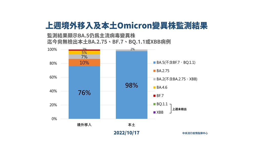 指揮中心公布,上周國內新增100例Omicron亞型變異株確定病例,分別為41例本土個案(40例BA.5、1例BA.2),以及59例境外移入(45例BA.5、1例BF.7、6例BA.2.75、4例BA.2、3例BA.4.6)。