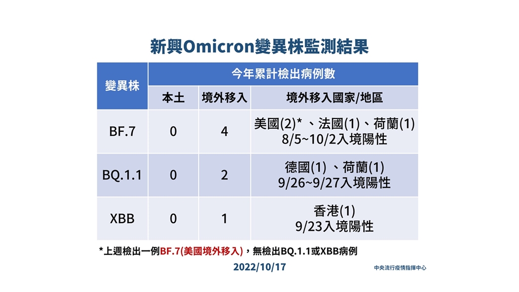 羅一鈞進一步說明,BF.7為BA.5的分支,境外移入曾檢出4例,分別為美國2例、法國及荷蘭各1例,入境日介於8月5日至10月2日;BQ.1.1同為BA.5的分支,境外移入曾檢出2例,分別為德國及荷蘭各1例;XBB曾檢出1例,個案9月23日於香港入境,要注意的是新加坡超過半數個案為XBB。