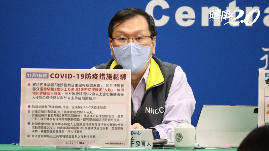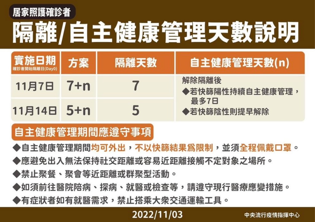 隨國內疫情持續降溫,防疫鬆綁,11/14起,確診隔離從7+n再減為隔離5+n。11/14快篩確診案例只需隔離5天,隔離天滿即可快篩,快篩陰即解除自主健康管理限制,快篩陽性者在未來7天內,只要有1次快篩陰性即可解除自主健康管理。