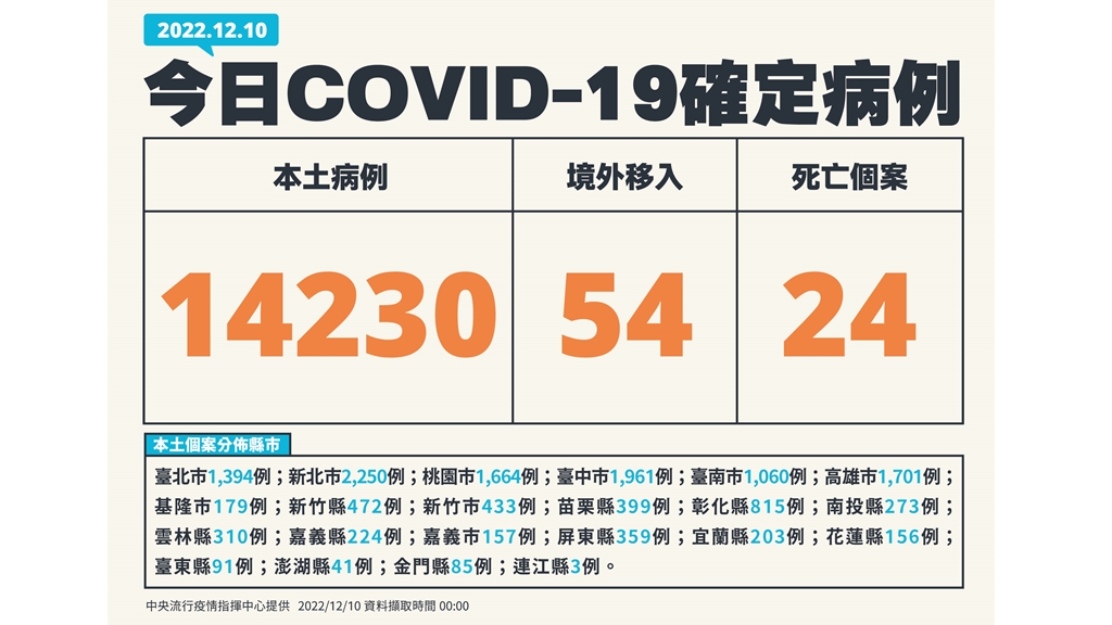 今日公布的新增40例本土病例死亡個案,29例為男性、11例為女性,年齡介於30多歲至90多歲以上,皆屬重度感染。36人具慢性病史、26人未接種3劑以上COVID-19疫苗。確診日介於今年5/18至12/13,死亡日期介於5/18至12/14。