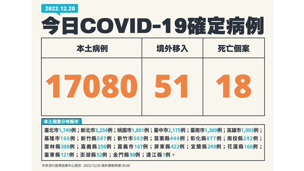 中央流行疫情指揮中心今(12/20)公布國內新增17,131例COVID-19確定病例,分別為17,080例本土個案及51例境外移入;另確診個案中新增18例死亡。今日新增的病例數較上周二減少38例,減少約0.2%。