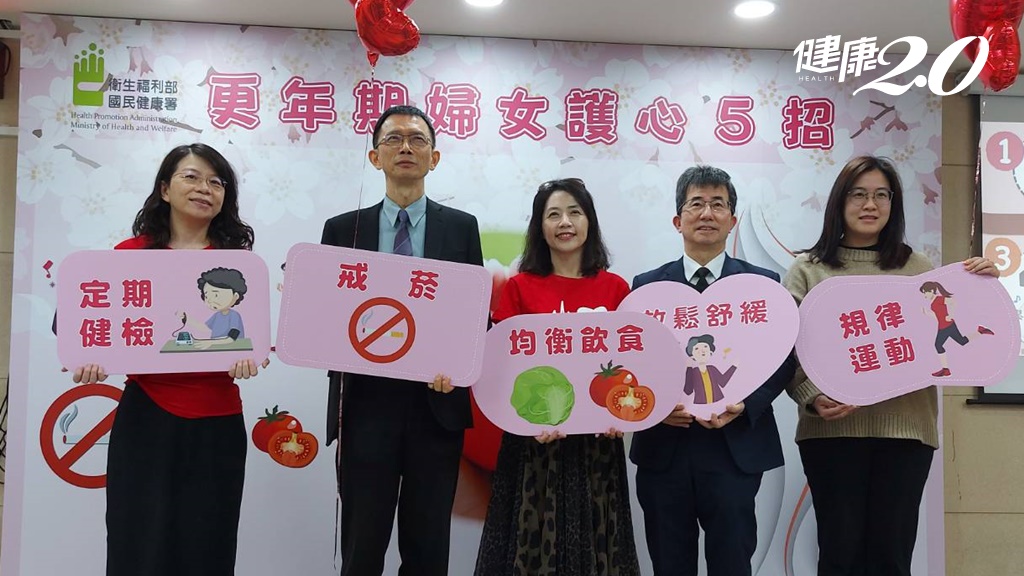 更年期女性因為少了雌激素保護,心血管疾病風險大幅增加。女性十大死因排名中,和心、腦血管相關就占23.6%,且女性心臟病猝死和男性不同,往往沒有胸痛症狀,醫師提醒,女性心肌梗塞可能會呼吸不順、手麻、心悸、背痛,有這些警訊都不能忽略,尤其心悸若合併呼吸急促、頭暈、胸部不適就要趕緊就醫。國健署也提出護心5招,呼籲女性注意自身健康。