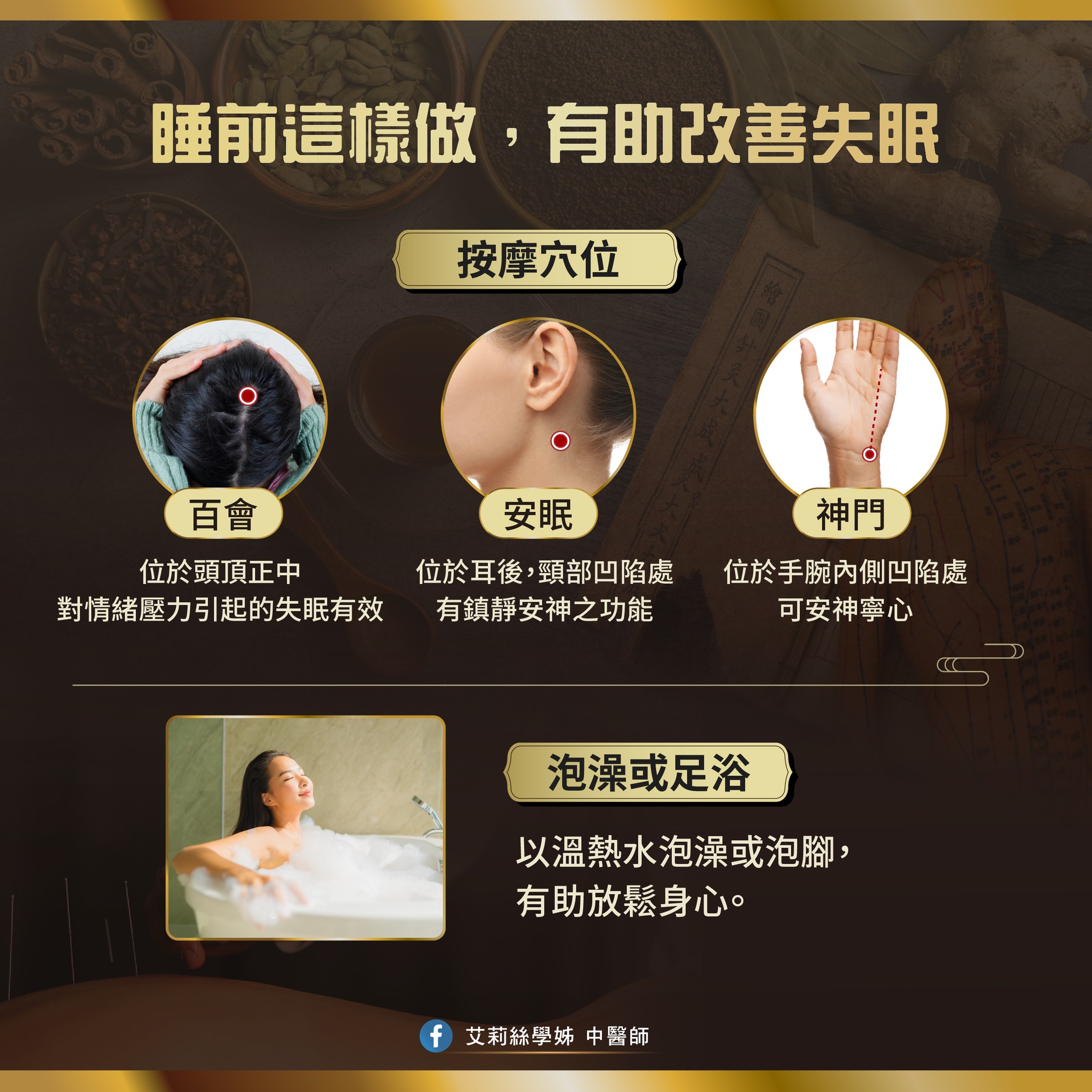 按摩穴位:如百會、安眠、神門有助鎮靜安神。另外,以溫熱水泡澡或足浴有助放鬆身心,也對於睡眠有幫助。