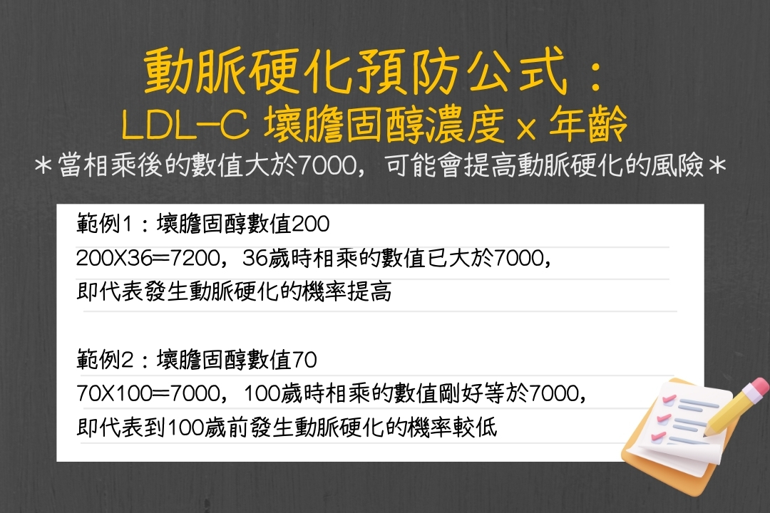 舉例來說,若壞膽固醇是200,當36歲時相乘的數值就已大於7000,即代表發生動脈硬化的風險恐提高;若能將壞膽固醇維持在70,活到100歲時相乘的數值剛好等於7000,即代表到100歲前發生動脈硬化的機率較低。