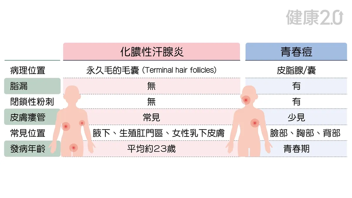 黃毓惠表示,青春痘主要分布在臉部、胸部、背部等皮脂腺密集的部位,經治療通常能改善;而化膿性汗腺炎則好發於腋下、頭皮、臀部、腹股溝、肛門周圍、生殖會陰部與女性乳房下方,通常長在頂漿腺集中或皮膚摩擦頻繁的部位,不僅會出現疼痛性結節、膿瘍、竇道與瘻管等大範圍病灶,且短短6個月內,就可能反覆發作2次以上。
