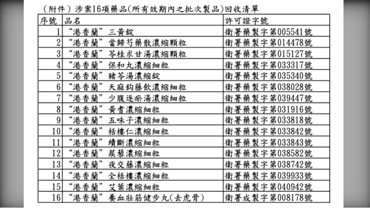 為保障消費者用藥安全,衛福部要求港香蘭藥廠立即配合擴大預防性下架回收三黃錠、當歸芍藥散濃縮顆粒、苓桂朮甘湯濃縮顆粒等共計16項藥品。業者必須在一個月內完成所有批號(效期內所有產品)的回收作業。