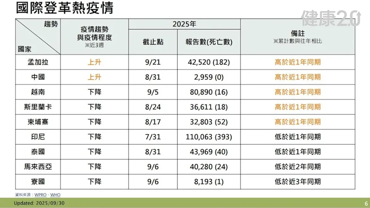 不只台灣,全球登革熱疫情也相當嚴峻。去年(2024年)是有紀錄以來最嚴重的一年,而今年疫情絲毫沒有趨緩,全球已累計超過426萬病例、3,005人死亡,美洲地區的巴西、哥倫比亞及墨西哥等地尤其嚴重。
