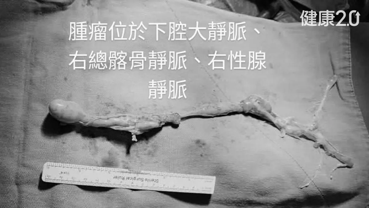 去年12月底動手術時終於真相大白,「血塊」其實是少見的血管平滑肌瘤,有如香腸般從卵巢附近的大靜脈順著血管一路往上生長進右心室,總長度達42公分。