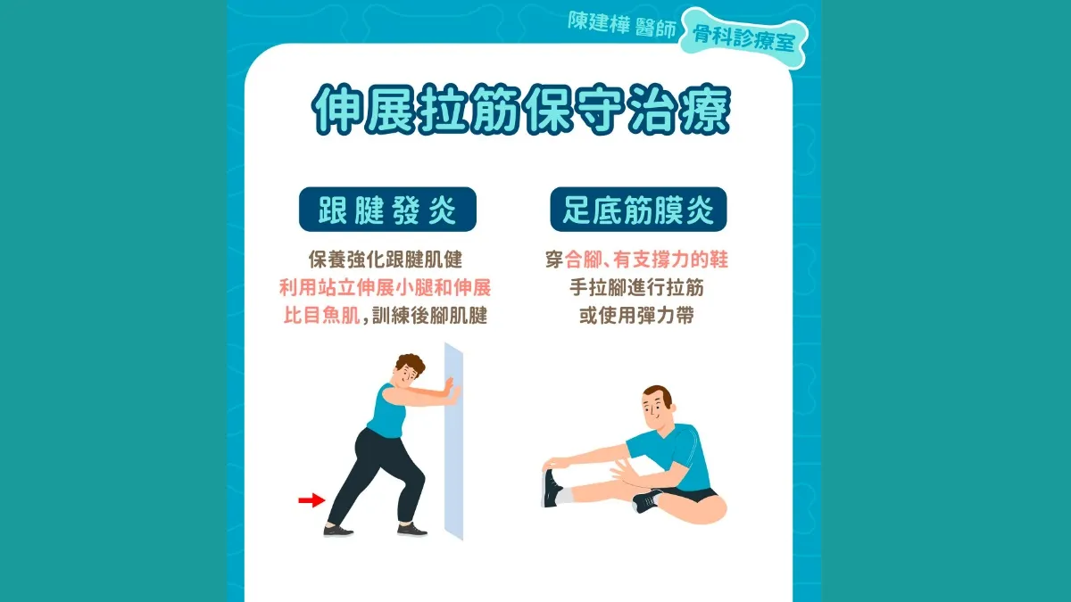 陳建樺表示,無論是跟腱炎或足底筋膜炎,初期治療,都以保守治療為主。急性期可冰敷消炎,搭配口服或局部消炎止痛藥,並務必避免會引起疼痛的活動,讓受傷組織充分休息。症狀緩解後,可進行物理治療、適度拉筋伸展與肌力強化訓練。