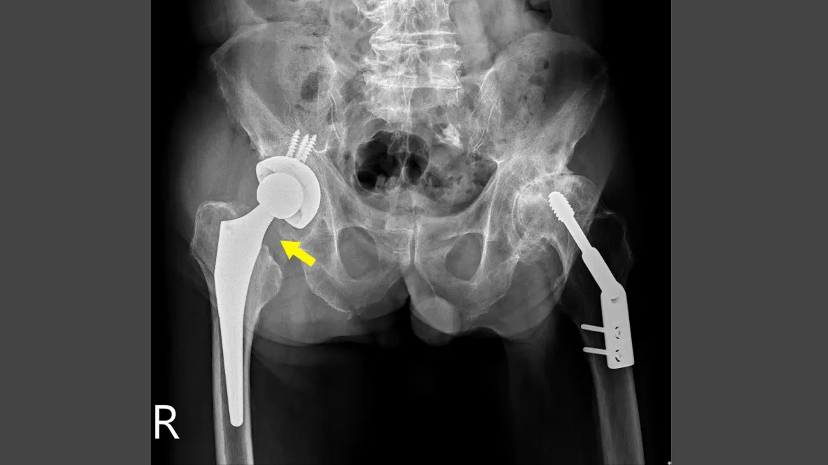 直到母親日前過世,施先生再次就醫時,髖關節已形成極大的磨損與壓迫。X光影像看到髖關節軟骨幾乎消失、關節處骨頭黏在一起、股骨頭磨損到扁平狀,只剩下一半,就像盤子一樣。洪舜奕醫師解釋,施先生的右腳因髖關節過度磨損,導致骨頭頭部只剩下一半,關節向上移位,造成步態不穩,無法久站。