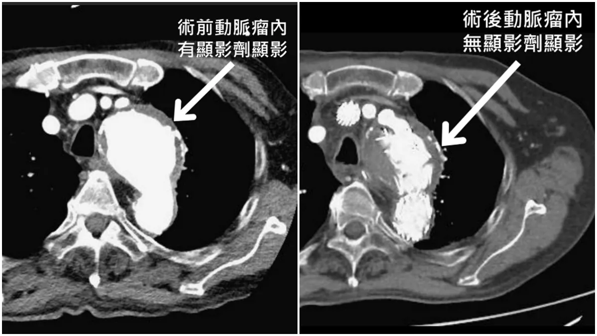 63歲謝先生,在民國94年因主動脈剝離,接受傳統開放式胸主動脈置換手術,後續追蹤發現主動脈弓部瘤逐漸增長至8公分,由於十分接近通往腦部的三個重要血管分支,若以傳統開胸手術會是第二次開胸,手術風險極高,北榮心外團隊評估後,建議使用客製化開窗支架治療。