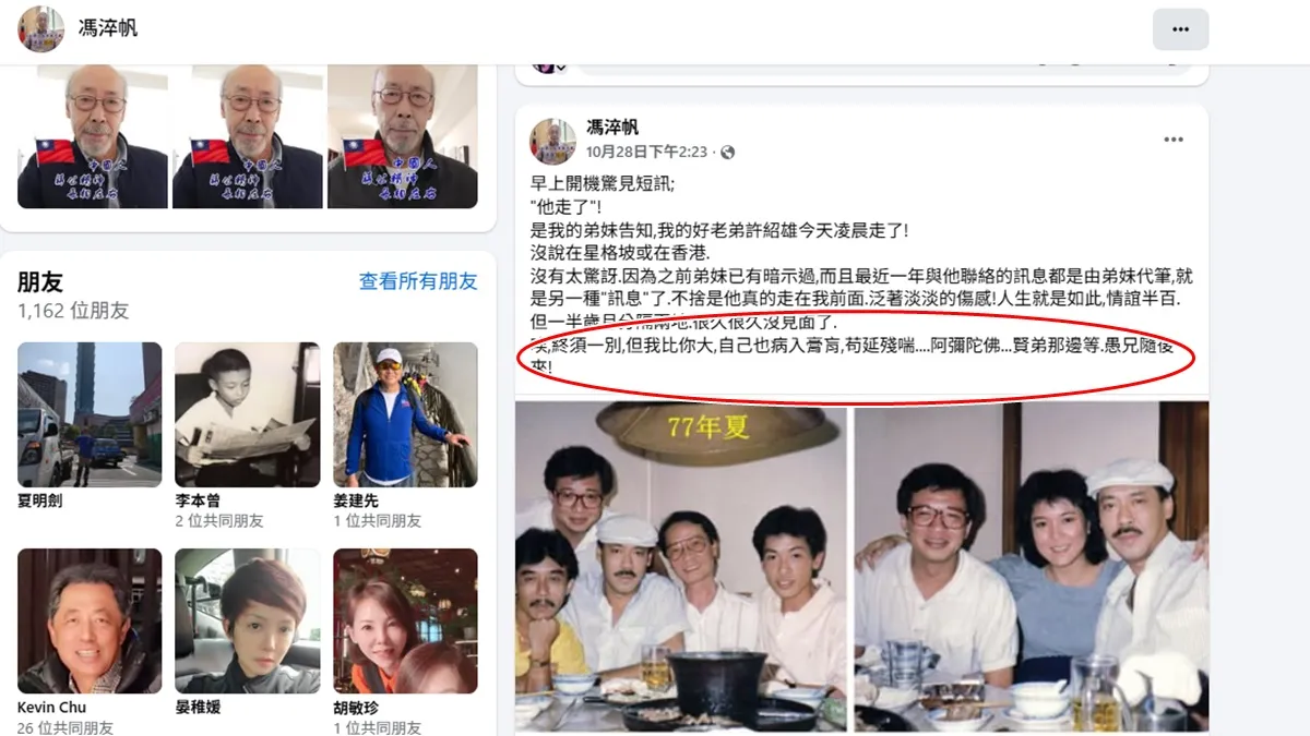 活躍於1980年代香港喜劇電影的馮淬帆,認同中華民國,自1986年移居台灣後,一住就是40年。今年他健康狀況急轉直下,3月住院至5月,出院後坦言對一切已感麻木。10/28他聽聞好友許紹雄離世,還在臉書寫下「賢弟那邊等,愚兄隨後來」,沒想到竟一語成讖,兩人相隔僅4日便在天堂重逢。