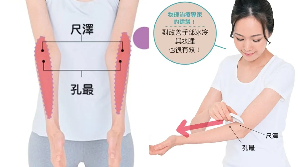 位於前臂、與呼吸功能相關的穴位有「尺澤穴」與「孔最穴」,被認為能有效緩解咳嗽。透過全面地推壓這些穴位所在的前臂外側區域,可以對肺部的經絡進行廣泛而集中的刺激。