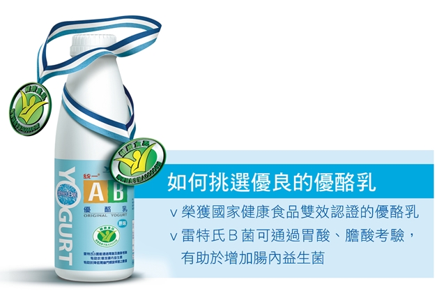 而優酪乳更是直接補充體內好菌的一個好幫手,那該如何選擇優酪乳呢?其實優酪乳的選擇方式,菌種占了非常重要的因素,因為再多的好菌,如果不夠強健,往往會先被胃酸及膽酸消滅,無法確實發揮益生菌的效用,AB原味優酪乳使用雷特氏B菌,可通過胃酸、膽酸考驗,有助於增加腸內益生菌,且通過2項國家「健康食品認證」,有了國家的把關,喝下去的優酪乳將會更有保障!